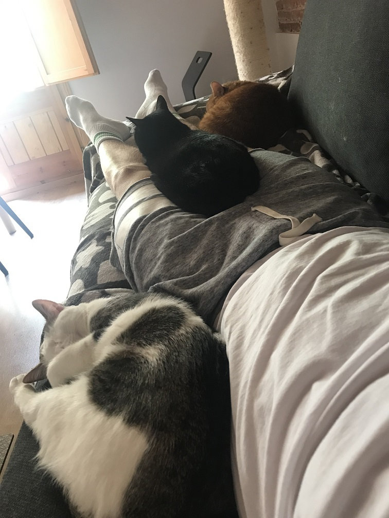 My three cats all also stray cats. Two of them I adopted from a cat shelter and one of them a colleague found in the garbage where she was thrown and left with her brothers.