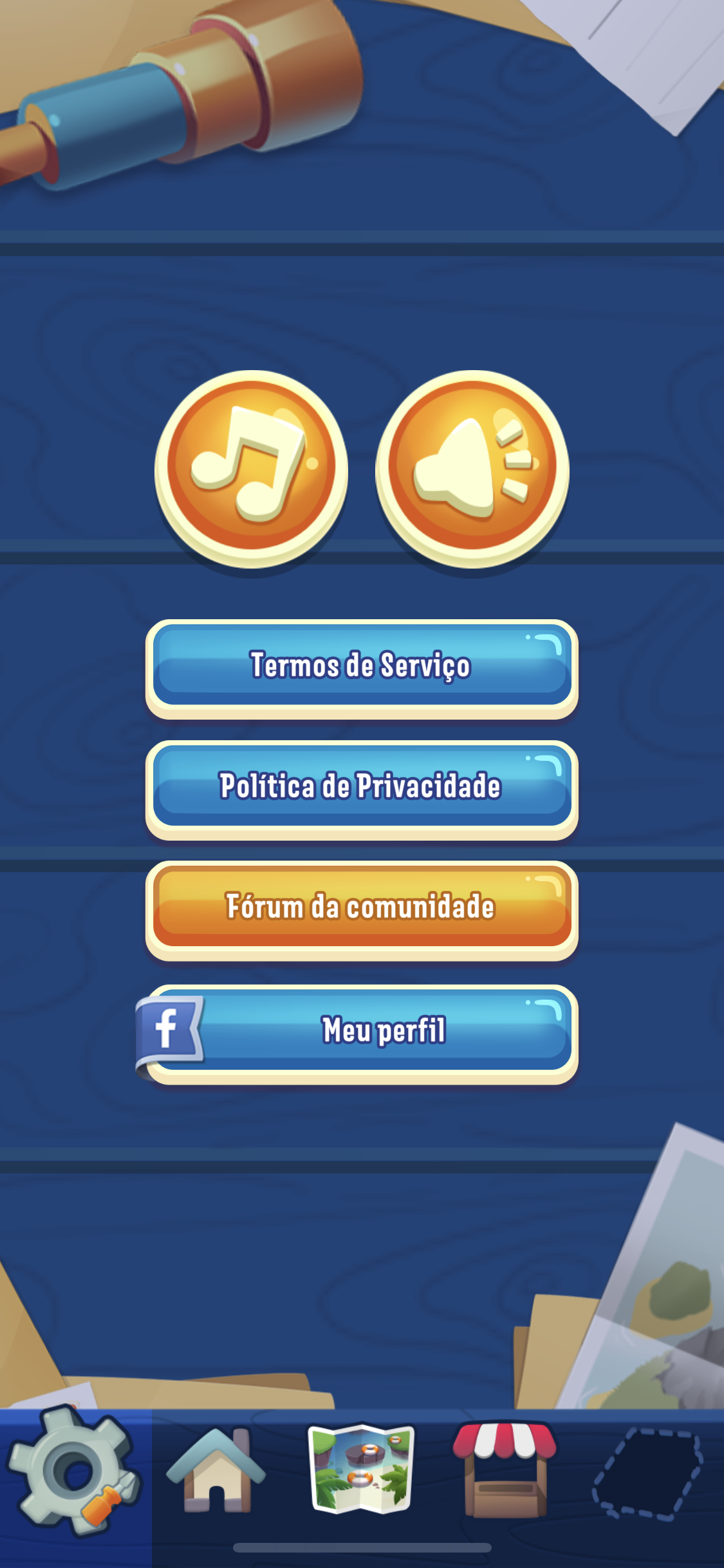 Welcome to the community also @ericacoelhog - You said you don't have the map at all? I can see the one screeshot is of your home, is the other screenshot what you get when you click on the map? It looks like one screenshot is of the stand with the red and white striped awning - which is where you can buy boosters and gold bars and the screen shot right next to it looks like your profile "the Wheel". You can see how each one of the icons is slightly highlighted. I don't see the 'map' icon highlighted.