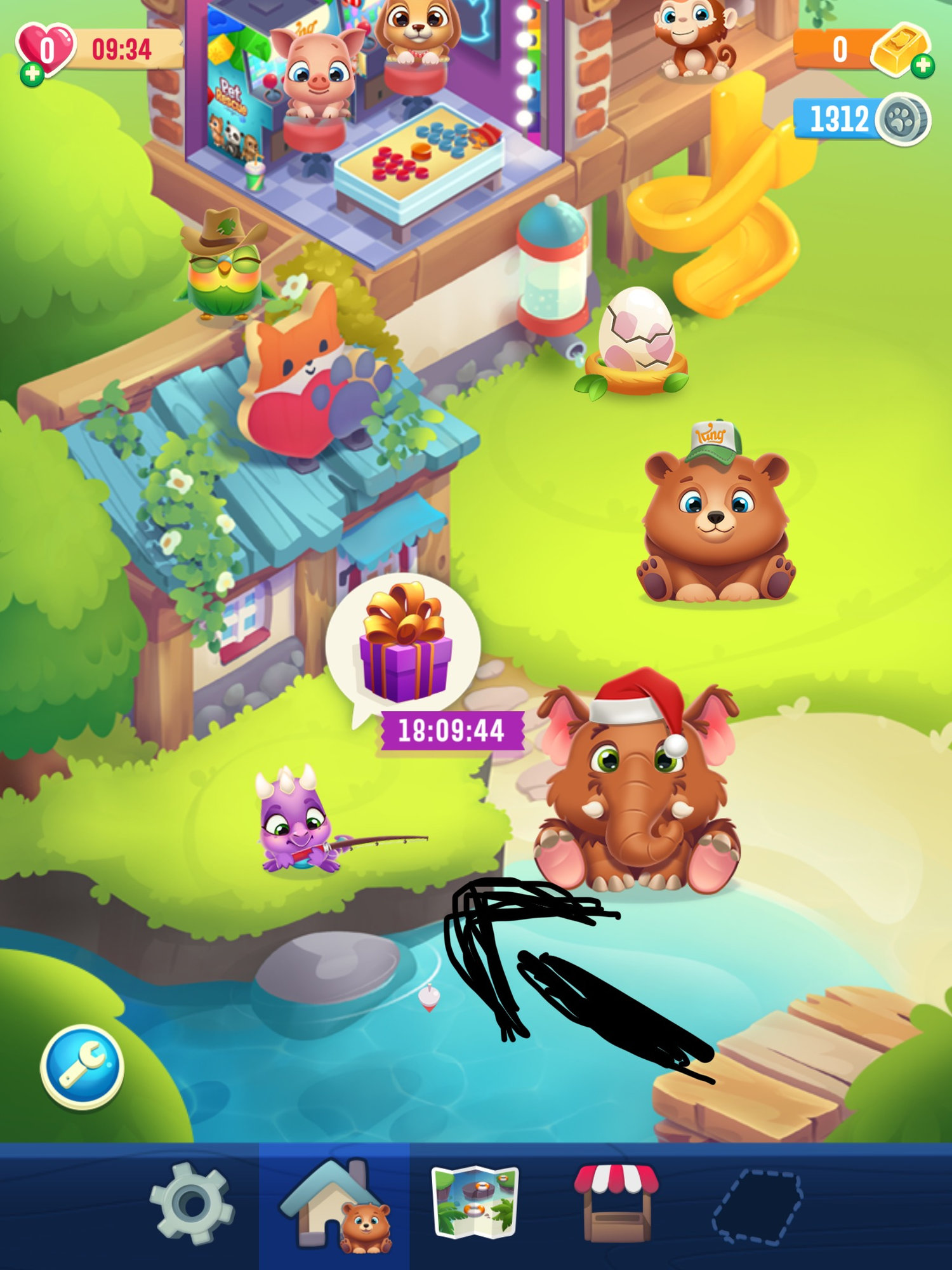 I have not been able to get screenshots from my tablet. I have no keyboard on it and it is an old one and it might not have the app. The screen looks like the old one with some of the pets still interacting but nothing in the fishing spot.