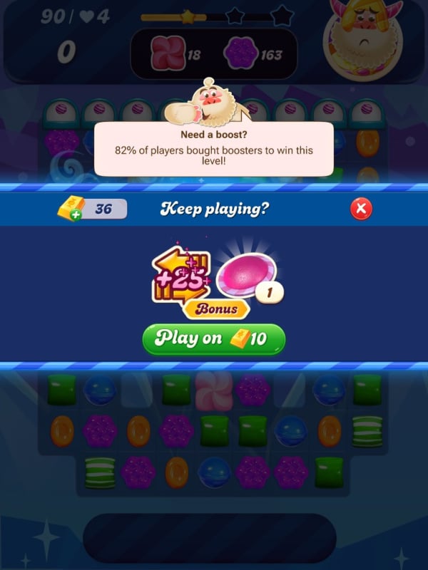 Level 90 I ran out of lives and didn't want to spend more gold bars as I was running short, but the game gave me five more lives for free! and then this offer, well who can refuse this: