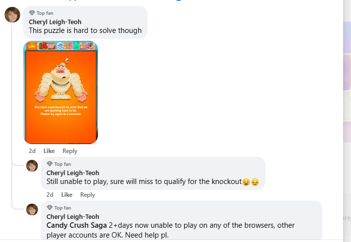 Other accounts on the same PC are OK. Tried Chrome incognito mode, able to play only or 1 level, back to monster issue. Looks like cache issue at King's end. Need help pl.