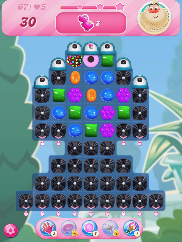 So by level 85 I've run out of lives and out of boosters: The three boosters we get for free were used on second or third attempts at levels 59, 68 and 75. (Other accounts will need to use it for level 72 instead of 68, it does vary.) The 10 minutes timed boosters after the first episode race were wasted on easy levels.