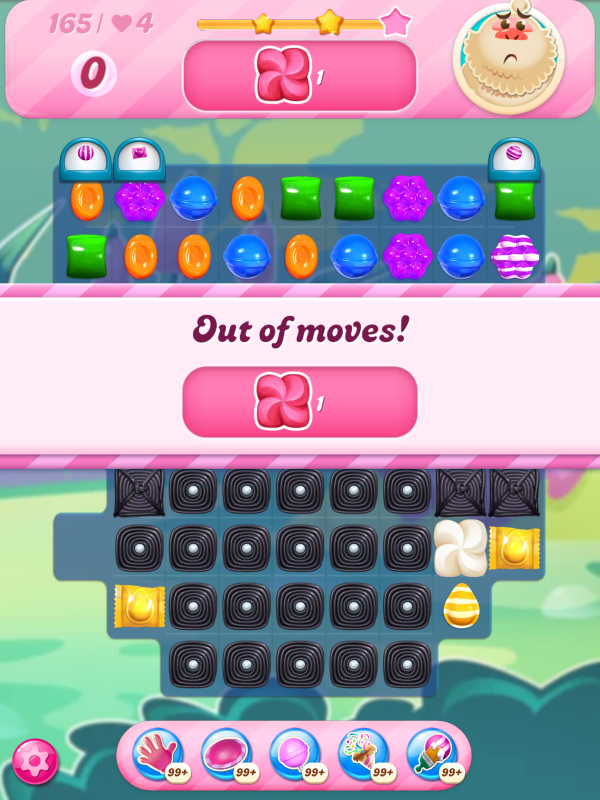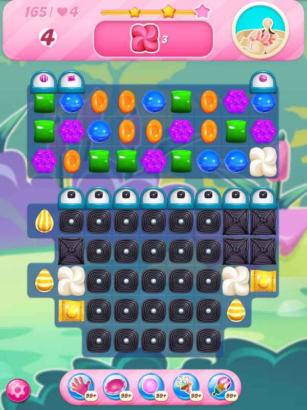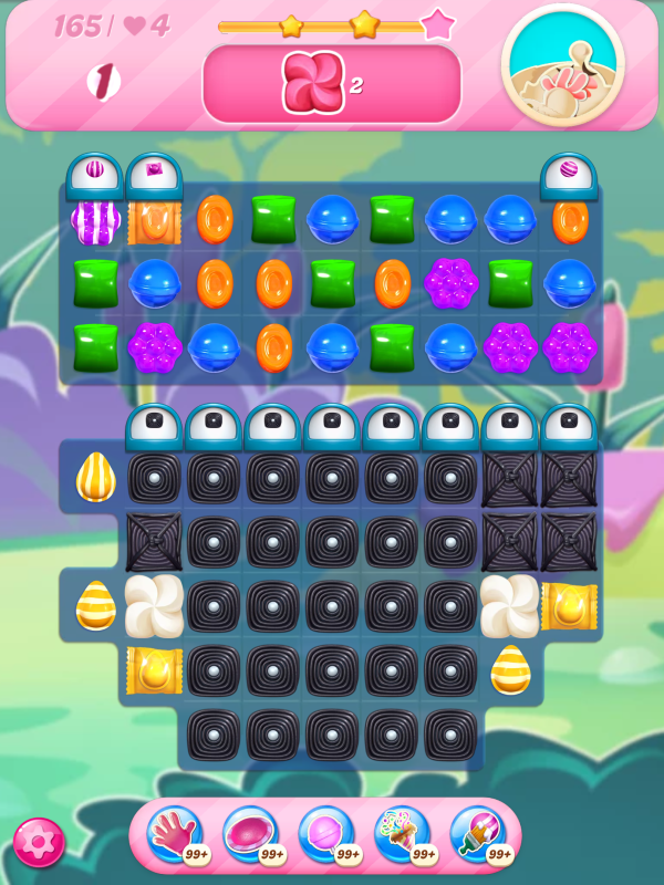 Here my example of level 165. I never had any problems to pass this until this week. Now I have jelly fish combos creating this kind of impassable scenario: