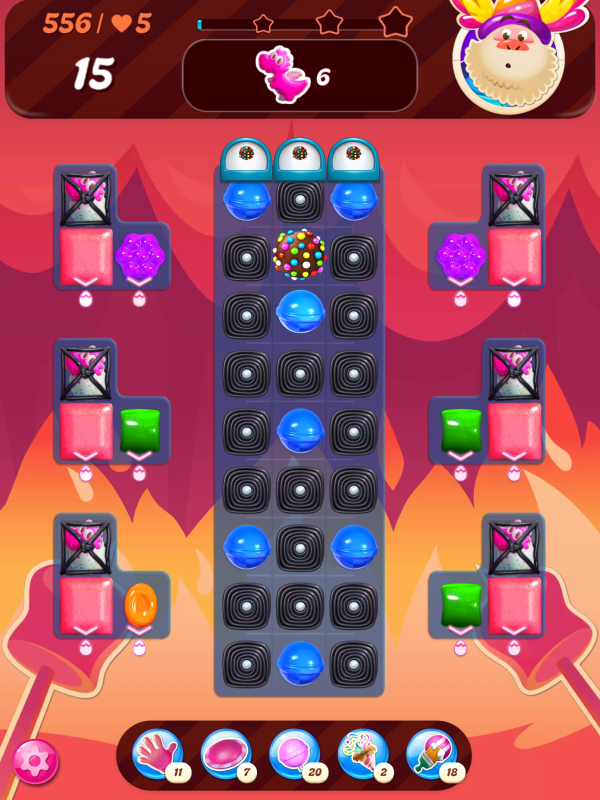 I thought maybe at the 5 moves left mark the game was going to trick me by not leaving the colour bombs next to the correct colour candies. But this game is simply not intelligent enough to do that now ( a human programmer could have done it I am sure) . So I continued with the hints here and won easily. The game even gave me a colour bomb + fish combo to finish it off with 4 spare moves!