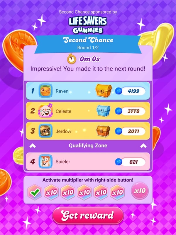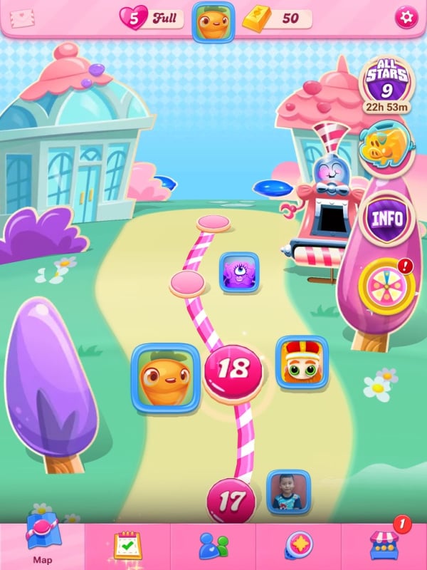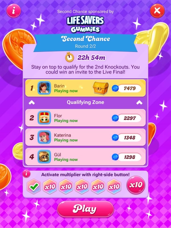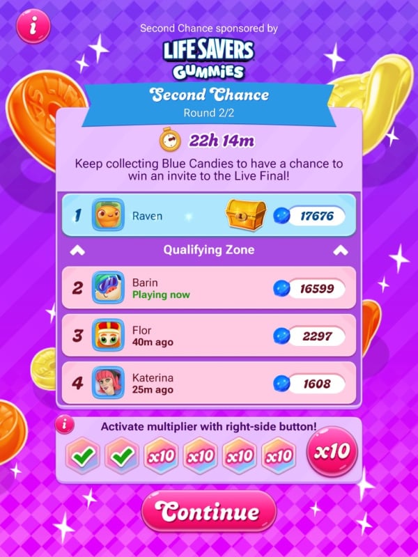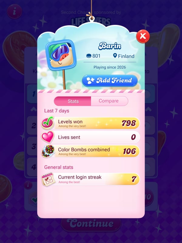 This one is such a strong player and my levels are so slow. I can't press "skip" yet and the candies don't drop fast. It's hard to keep up. Luckily Barin is also playing really slowly, which I find really odd but it helps me. They only passed seven levels in the whole time they've played 22 (and scored 16,599, wow!).