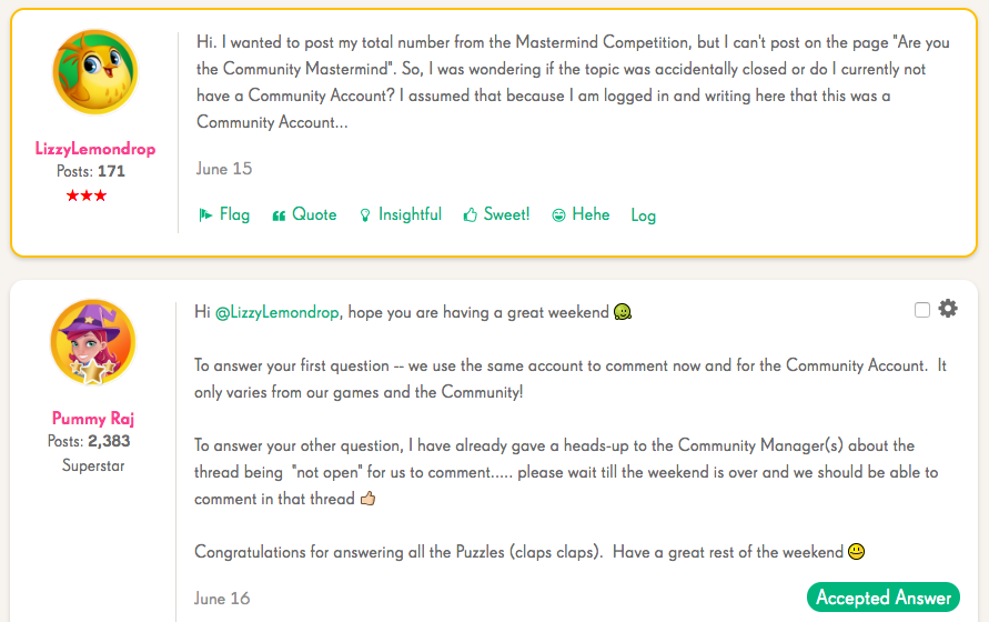 And on top of that, there are badges connected to answers as well. If you want to make it to the top of our leaderboards (which you can view here), we recommend you visit the "Somebody needs help" section of your favourite game to help players out and get as many points as possible!Here is an example of an interaction that granted @Pummy Raj in this case 10 points, for helping @LizzyLemondrop out: