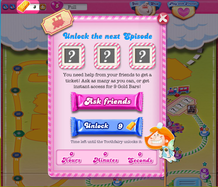 I'm brand new! In the Candy Crush Saga, I just finished level 65 and only have 3 gold bars left. I spent them unlocking each new episode because even after 72 hr, the tooth fairy does not unlock the next level. Can someone please help me? I would really appreciate it. Thanks!!!