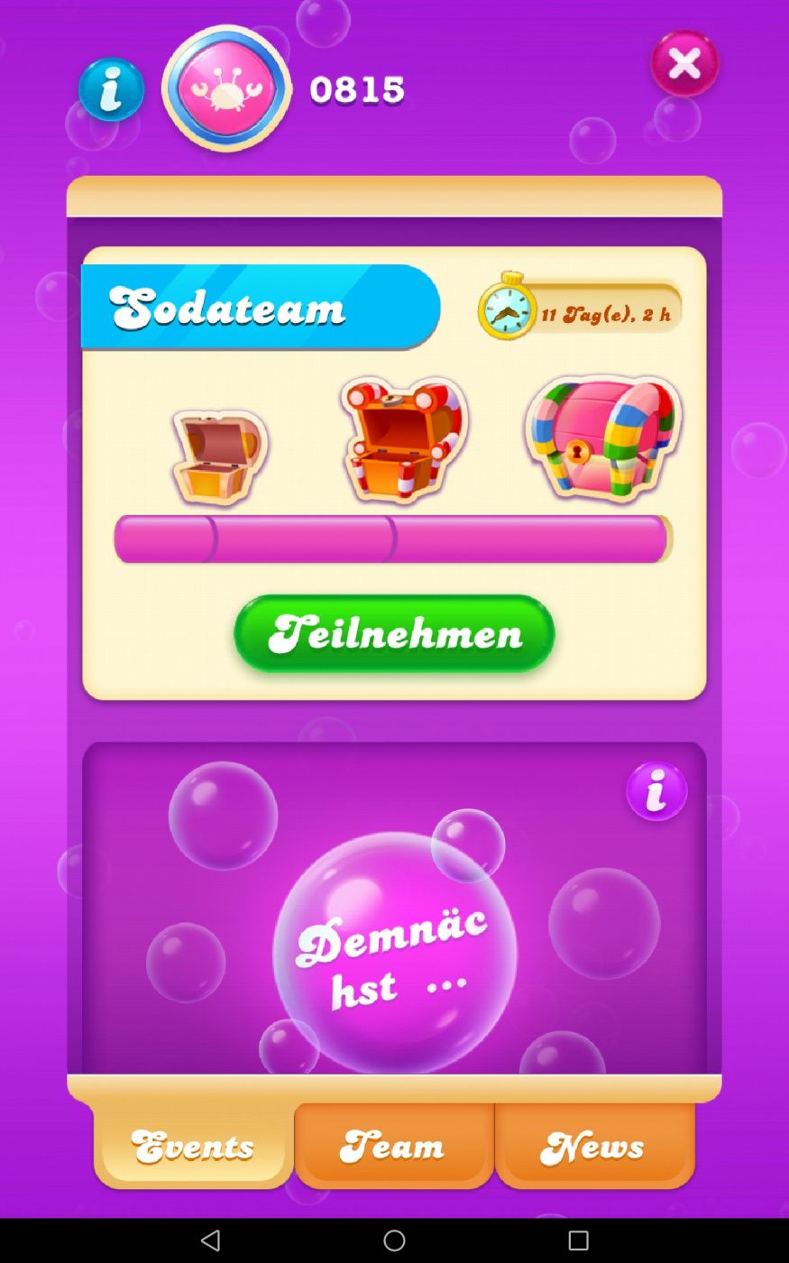 @Spinnifix ja, das ist aus Soda Quad. Unter Event kam bei mir (nur in der mobile App und nur bei der neuesten Version), dass ich eine Torte backen kann. Die Torte hat 4 Schichten und nach jeder Schicht gibt es eine Belohnung für alle Mitglieder im Team. Du darfst nur kein Level beim Tortenbacken verlieren, dann wirst du in die Spülküche verbannt, bis dich jemand für 5 Goldbarren freikauft. Da ich genug Goldbarren hatte, habe ich mich selbst freigekauft und die Torte zu Ende gebacken.