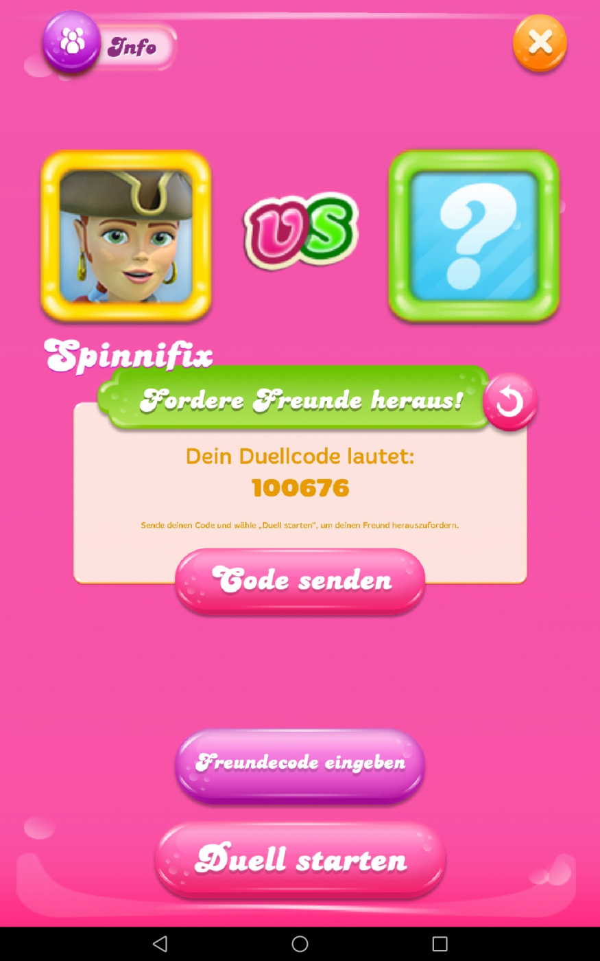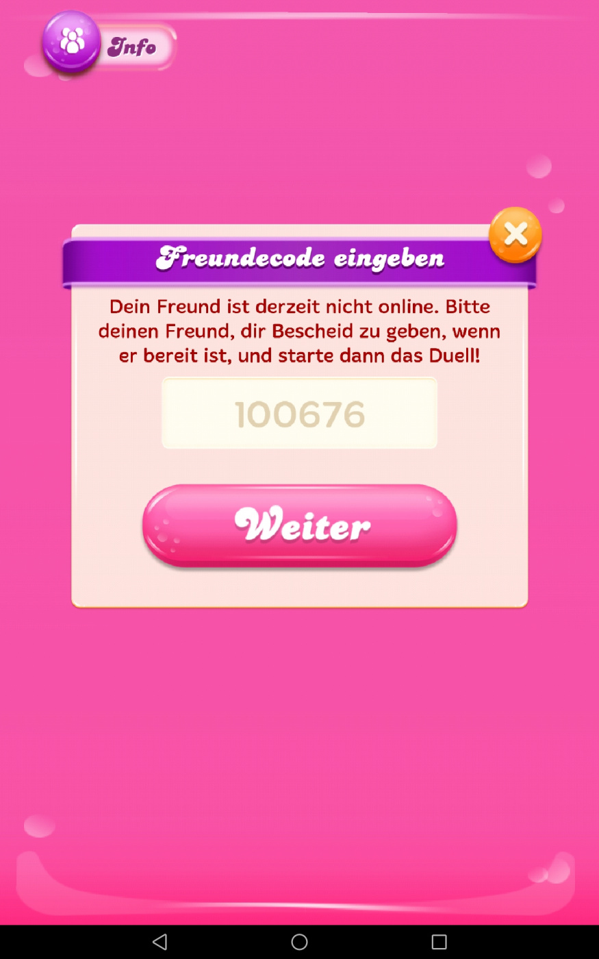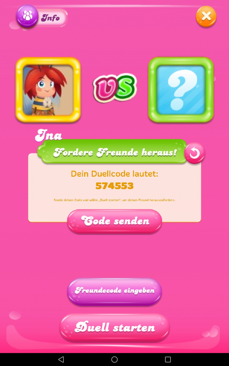 Wenn du möchtest, können wir beide gerne das Jelly-Duell spielen, nur zum testen. Wenn ich den Code bei mir eingebe oder du den Code aus meinem Spiel, sollte es funktionieren. Es wäre für dich eine gute Übung, denke ich.