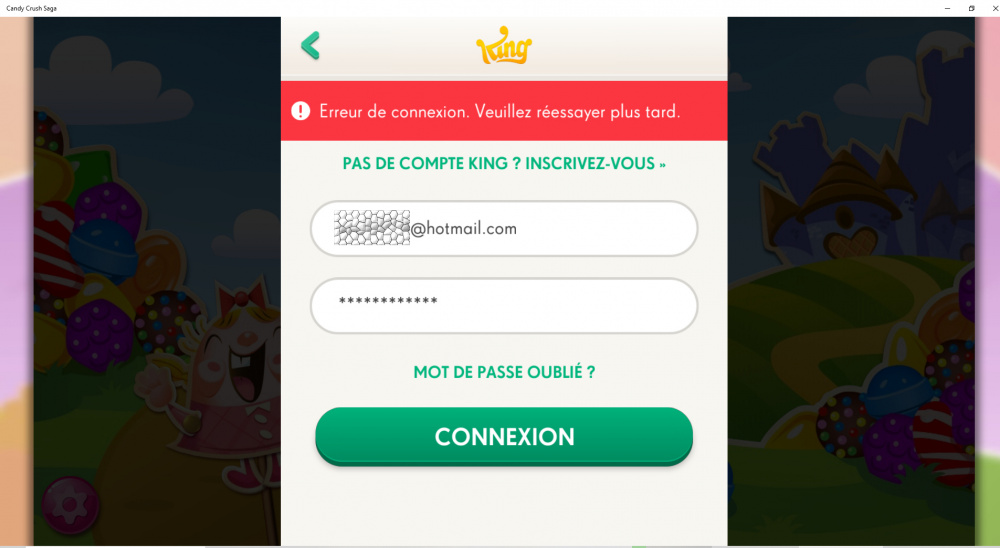 0 · Helpful Woah! Sweet Love HahaMerci pour vos réponses. Je n'ai pas de compte Facebook, je me connecte avec une adresse mail sur mon compte King. Mais depuis je ne peux plus me connecter, lorsque j'essaie de réinitialiser le mot de passe, mon adresse mail est bien reconnue, je reçois le mail, je clique sur le lien, j'entre un nouveau mot de passe et j'ai un message d'erreur : "Attention : Une erreur est survenue. Essayez d'actualiser la page." Je le fais mais ça ne change rien. J'ai essayé depuis plusieurs navigateurs, en vidant les caches et suppriment les cookies mais ça ne change rien...