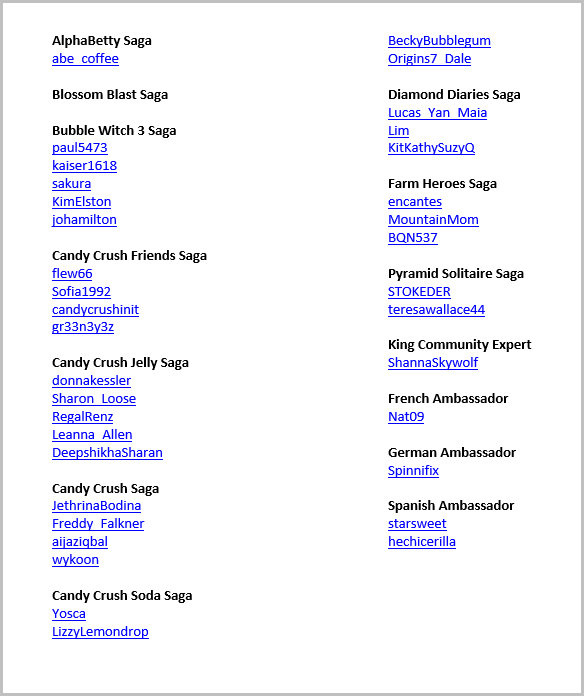 Think @Elsa has the "Current List" for everyone & every game. Might want to ask her, to repost it here. I have it "Bookmarked", but right now, my bookmarking list needs "Editing". Have lots of old contests, support issues, that need cleaning up, just haven't had the time to do it yet.