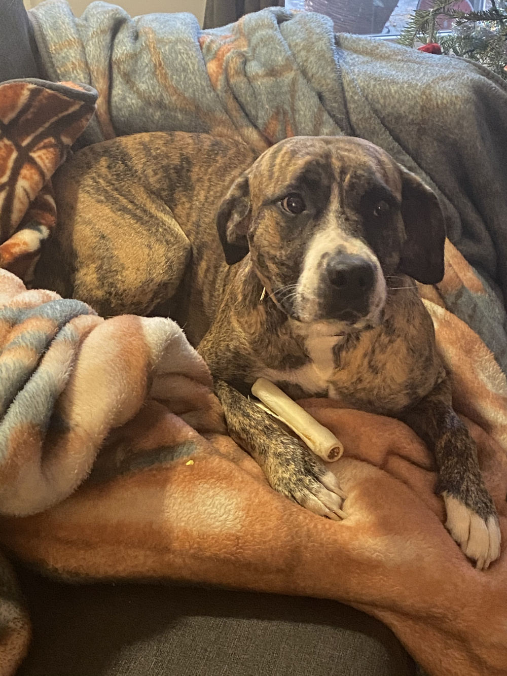 Mon fils est venu visité à Noël avec son chien Alexa, elle est super belle, mais très craintive pauvre bête, son autre propriétaire la gardais dans une cage. 😞 Elle s’assit dans le divan et ne bouge plus 😕 Elle est tellement fine, beaucoup moins craintive depuis qu’elle est avec mon fils 🥰