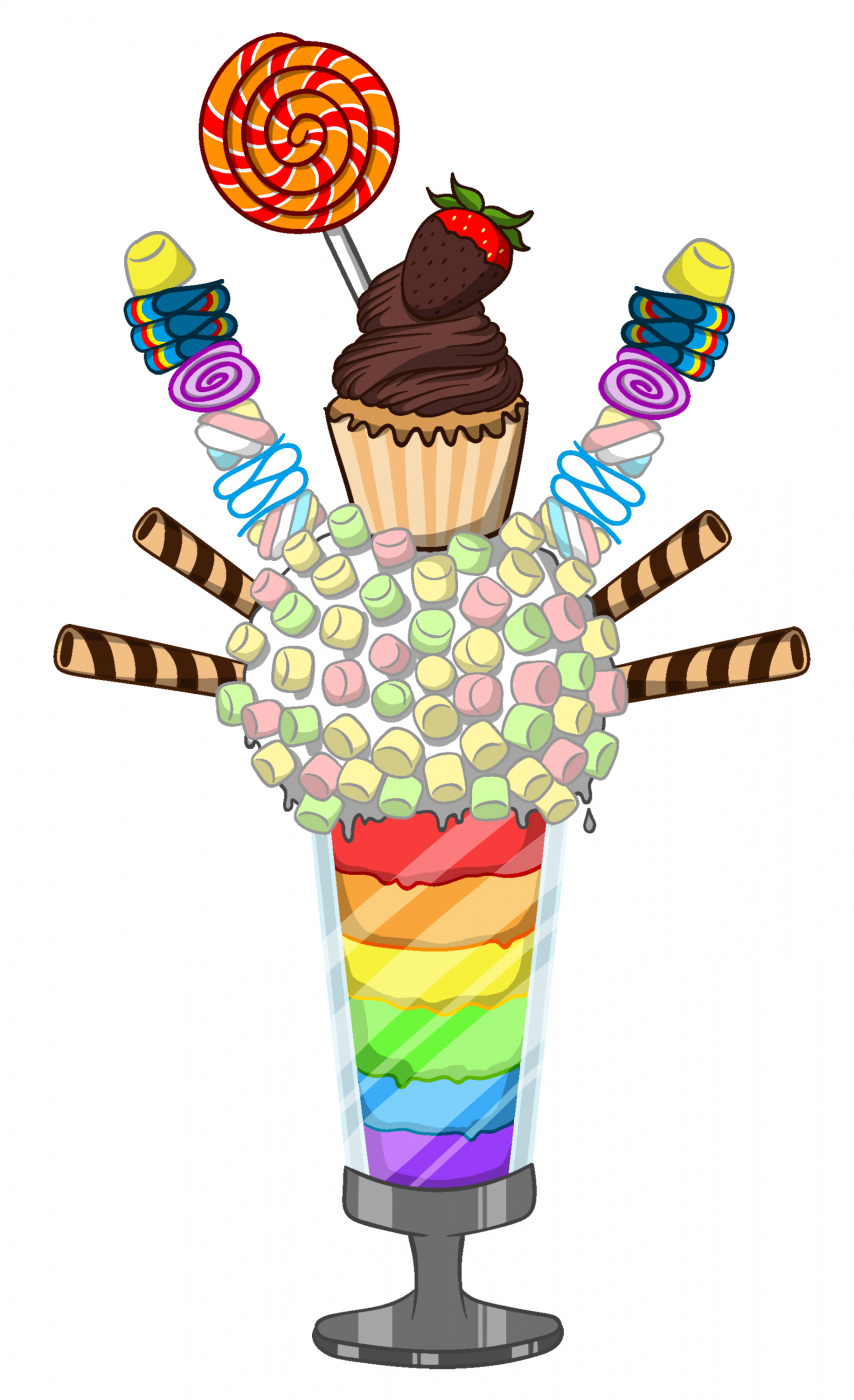 De la copa sobresale una bola de helado gigante con sabor a vainilla, repleta a su alrededor de masmelos de diferentes colores, y como si fuera poco, tiene insertado a sus costados barquillos (así los llamamos aquí en Colombia) de chocolate y brochetas de gominolas y ¡más masmelos!