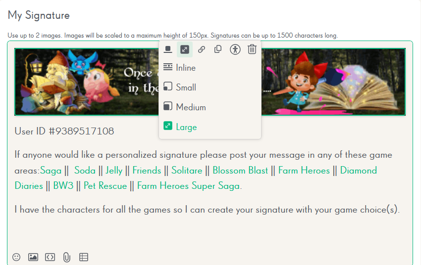I can create a personalized signature for you with the characters from all the King games so you are not limited to just Friends characters. Just let me know which game(s) you play and I will add those characters to your signature.