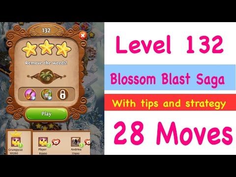 Blossom blast saga level 132 has been updated again and now we get 28 moves. Here's an updated walkthrough. My Strategy for Level 132: Push leaves out of the way by ending links of flowers next to them. Link flowers to bloom next to weeds and set off chain reactions to wear down those weeds. Gradually work your way downwards. Watch my walkthrough for in-video tips and a demonstration (I only used 19 moves). https://www.youtube.com/watch?v=bne5D0-FG78