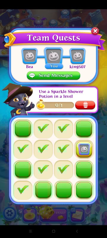 I am trying to finish the team quest as I picked the last tile in a row, whereby I must use Sparkle Shower potion. I created the potion and the tile did not clear nor did the challenge finish. I create another Sparkle Shower and still same thing happened.