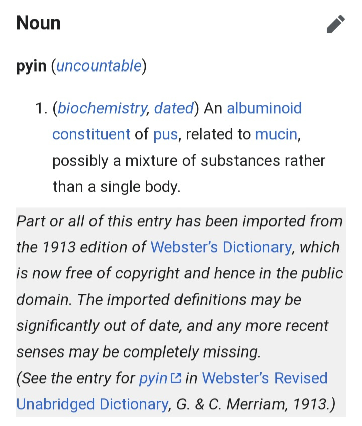 ⬆️ That's exactly the Pyin I meant, @Pitty_Kitty! And yes, plural exists. ᴸᵒᴸ The Principal of the Boarding School I attended for Middle School in England used to repeat this words countless times anytime she heard girls talking about the pus in pimples. She would tell us the word "pus"was too "vulgar". ᴸᵒᴸ And going back to what you said, she was probably from before 1913 herself! 😂