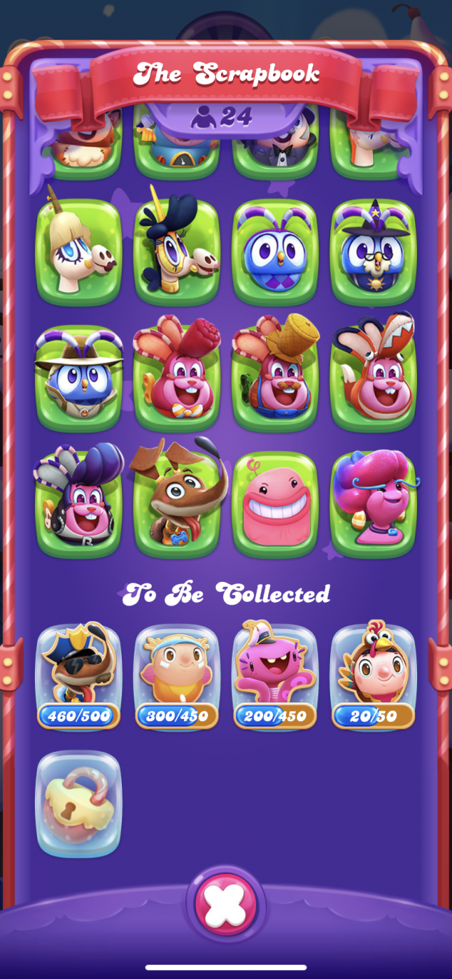 Hi, I need some information everytime i have collected a character on windows 10 app the next one has opened up to collect. I have a locked character in my scrapbook, but this is not opening and been through 5 complete episodes over 100 levels . Should i have this open up or is there a certain point in the game this opens up.