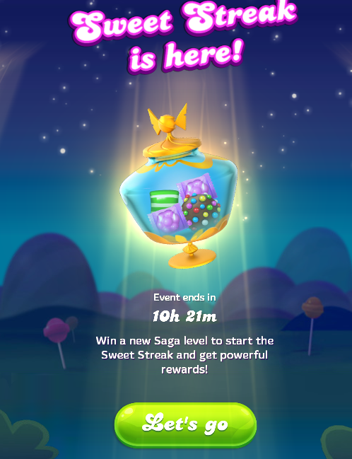0 · Helpful Woah! Sweet Love Haha@LiseCC Hi and welcome, The sweet streak is not a seperate feature. when you press play it will take you to the map. The win streak feature works by when you pass a level you start your streak and if you can get 3 wins on the trot to get maximum streak, but if you lose a level you streak reverts back to Zero and you have to start again. The win streak has 3 levels of starting boosters for your next level