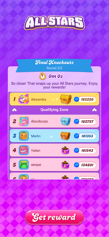 I made it to this last round. However, after about 3am est on the first day I stopped receiving the ability to get the Super Charger - Super Color Bomb. If everyone else was still receiving for the entirety (which appeared to be the case based on the scores), I was at a serious disadvantage and had no chance at winning. What was even more odd was it started appearing again the same night after the round ended. All good if everyone else lost as well, which again does not appear to be the case based on the scores. However, if that was an issue only on my end, very disappointing I had no chance and wasted so much time for nothingβ¦
