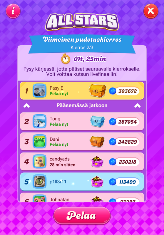 I wasn’t able to start until today morning when there was about 6,5 hours left. Got into a group that has been up at least 24 hours (or more?) and leader had 163k points. I was 27th and no one else came after me. I realized I had no chance so at first I played slowly 2 episodes, and then all of my 5 tokens but took breaks. At the top there was and still is a race going on 😊