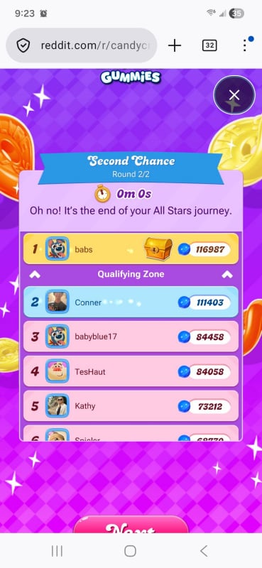 This was round 2 of the second chance, so only 24 hours. Note this score is significantly higher than the scores in Christine's board. My suspicion is that this means Christine was right in talking about number of levels completed or blue candies collected required to get the advantage of the VCR effect. Score alone doesn't do it. I assume this person used tokens to get this score, and apparently that wasn't enough. If Christine's theory is correct, you will need to crush lots of blue candies to get the guaranteed pass, not just get a high score through good use of multipliers.