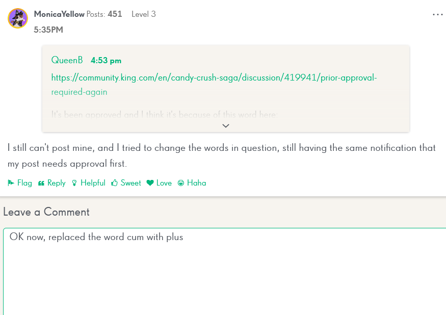 I still can't post mine, and I tried to change the words in question, still having the same notification that my post needs approval first.