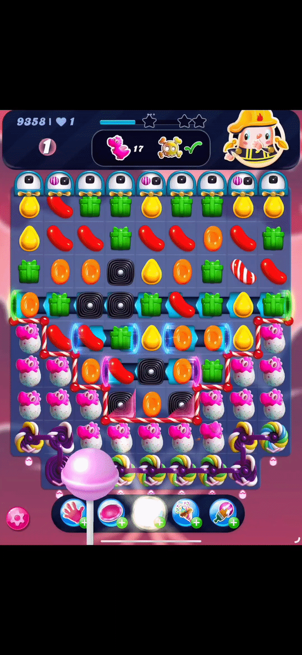 Just recently, I saw one Crusher seeing 17 poor baby gummi dragons helplessly trapped on the board of the legendary level 9,358, with their only way out blocked by a long rainbow twist that had already seen wear and tear on places, and was at its weakest on B9 and C9. They now had only one move left, and no match appeared that could sever the rainbow twist then and there to finish the level. Izzy also watched and was already worried that the Crusher's last move would have a good chance of leaving all her babies stuck up there to end the level in failure.