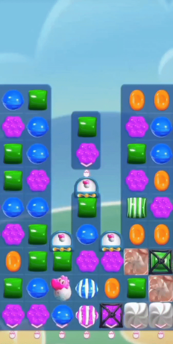 The GIF above demonstrates the bug in action affecting the Gummi Dragon Candy Cannon at E-5 (the center of the board, columns are lettered and rows are numbered). The player just made a move to free the level's penultimate dragon, and the Cannons will only dispense another dragon when there are none on the board. The middle Cannon then dispenses the final dragon, but if you watch the GIF closely, the Cannon drops them onto the spaces above the Cannon (E-1/E-2) instead of the tile directly below the Cannon muzzle (E-5) as designed.