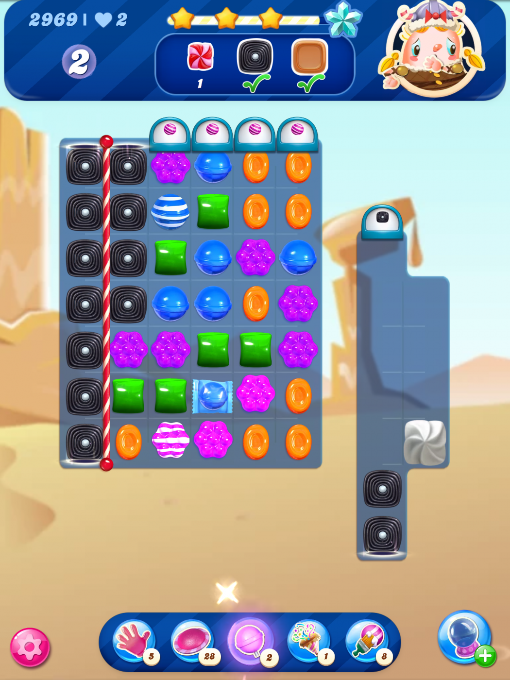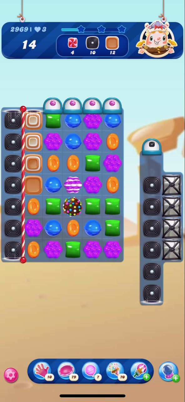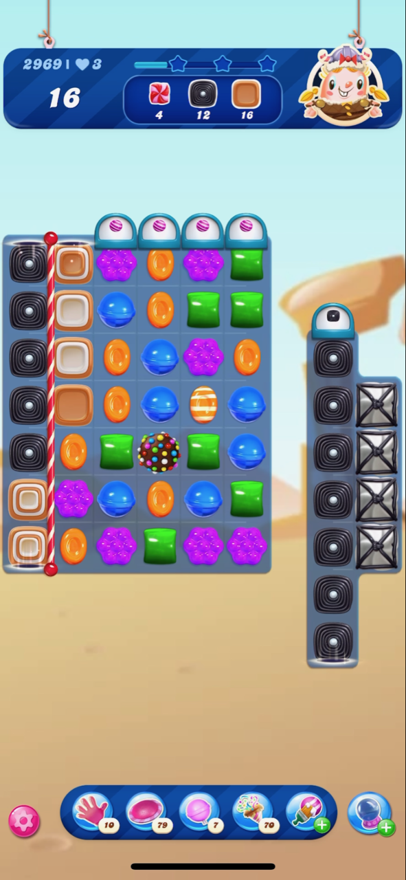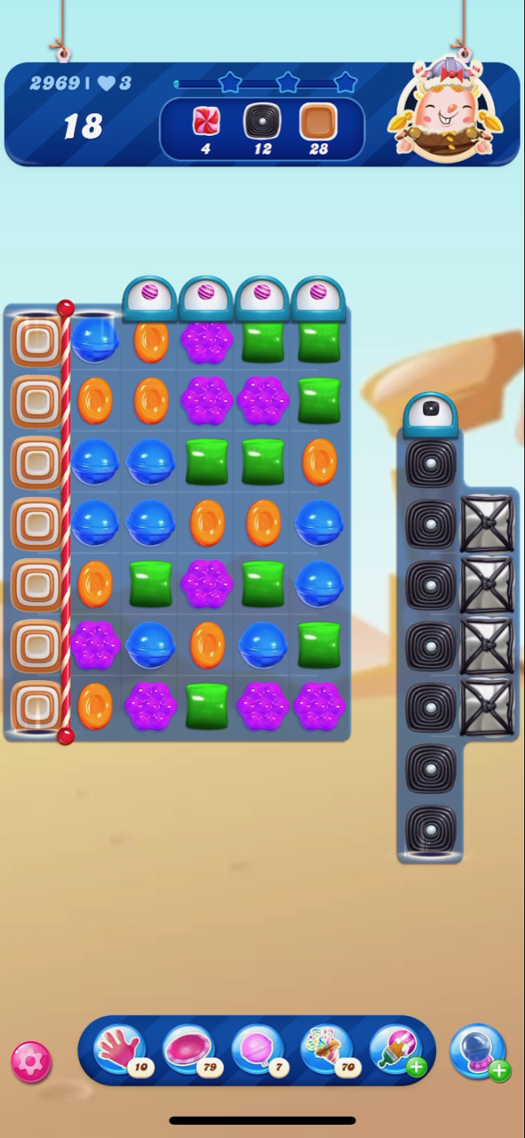 I just reached that level @MannyFae . This is my third attempt. I did have timed colour bomb booster, so that might have triggered something for me! As you can see here I have the wrap/stripe combo plus the blue stripe, which will leave me with just the one frosting on the bottom row.