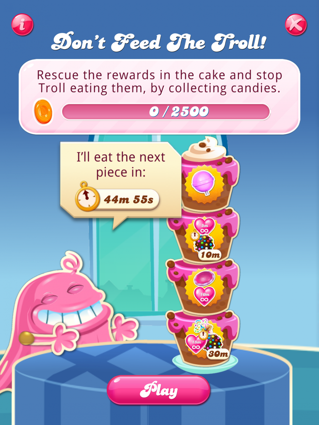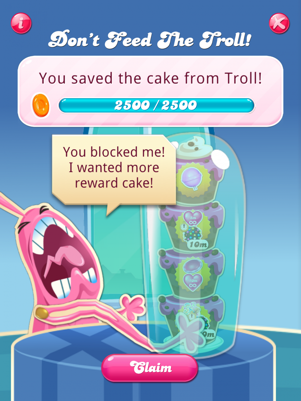 Hello @petenesh If you see the "don't feed the troll" event please immediately scroll back to an easy level with lots of orange candies, such as level 1000 for example, and then play this and replay this level until you have the 2500 orange candies needed. The timer runs down immediately you see the pop-up shown below so you need to stop playing new levels, drop everything (except the baby, please…) and collect orange candies from any level you know you can pass. Then make sure you claim the prize, which includes a party popper. The event will probably return tomorrow and again on Sunday, so there are three party poppers up for grabs. It is the only event I know that will give out free party poppers. Otherwise you would have to buy them. So don't miss out if you see this: