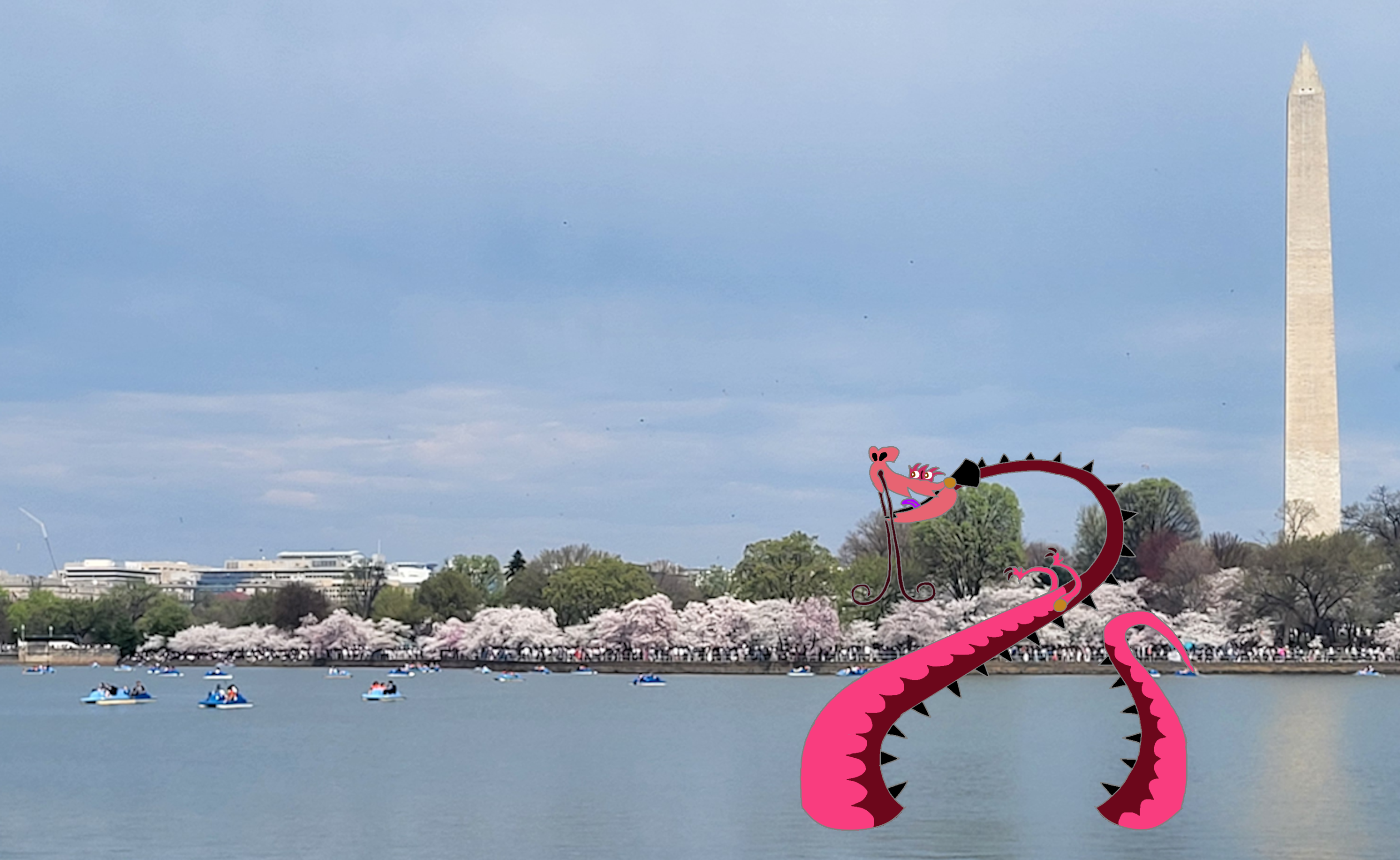 Normally, the Tidal Basin is where most people would trek around to see all the cherry blossoms, but since Denize is too huge of a monster to walk around the basin, she would let all the people have the walkways to themselves while having the pleasure of seeing the cherry blossoms in her own way: wade in the Basin itself! I just hope that the paddleboaters already pleasantly floating the basin would not be frightened by her towering appearance.