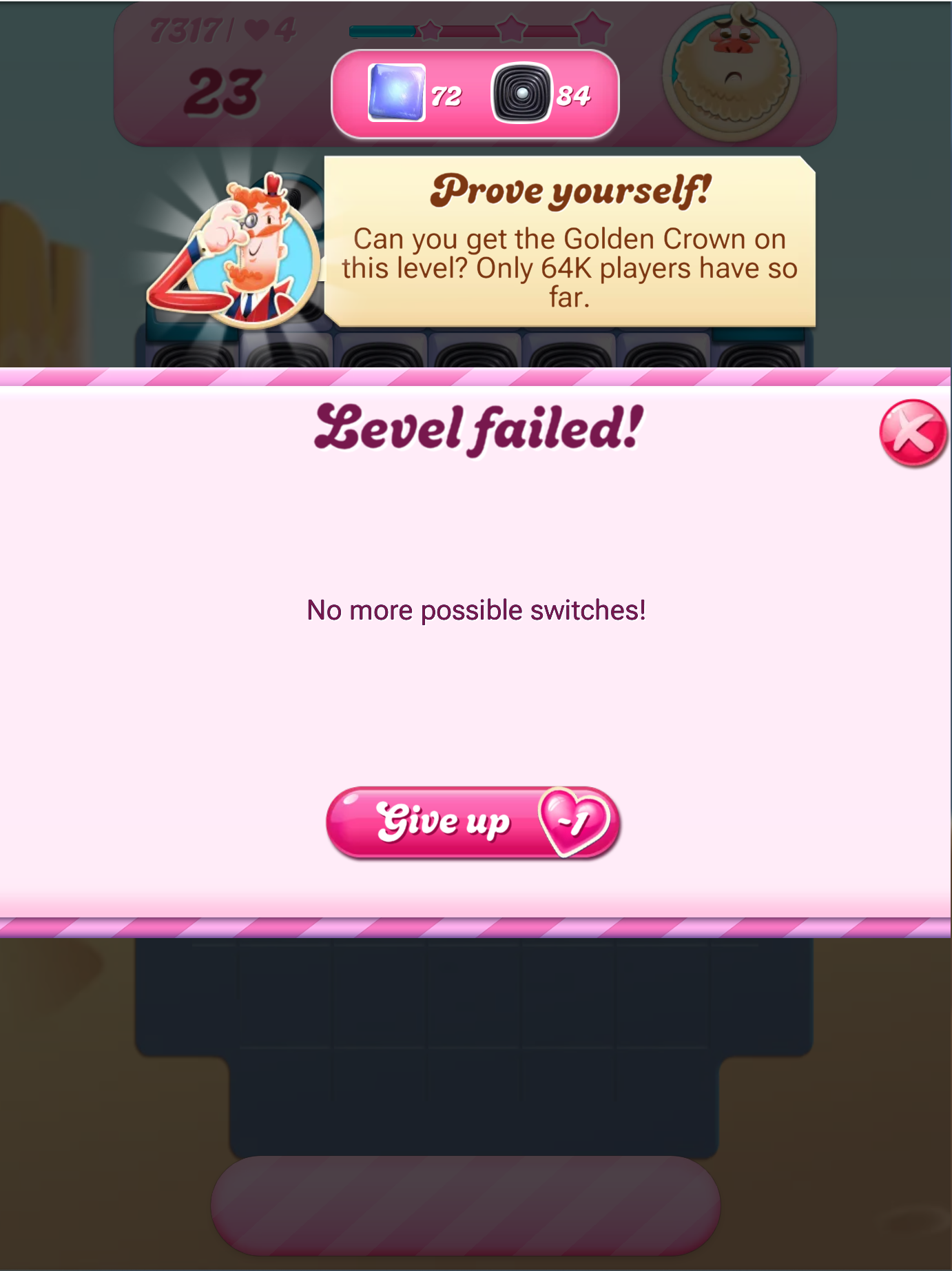 I made one move to put a colour bomb into a square candy and it wiped out the entire bottom of the screen's candies. This left no moves as there's nothing left to move.