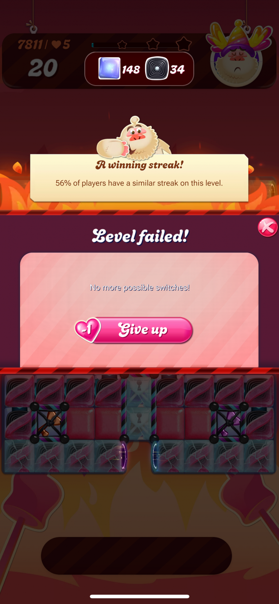 This level is completely unfair. I had a 90 win streak, timed boosters and can’t even make one move once the level begins. I would like my win streak given back to me. Terrible way to treat a CC maven! How on earth are you supposed to pass this level?