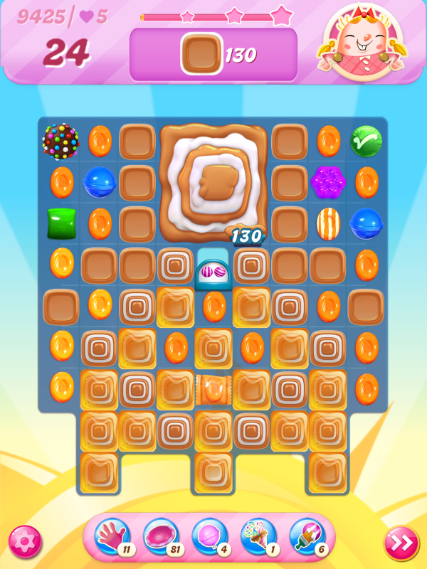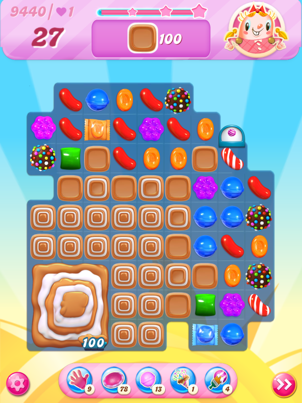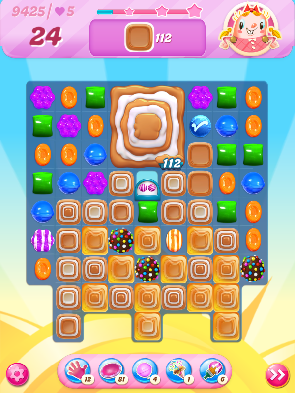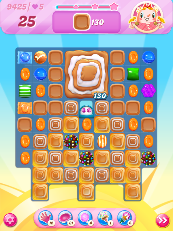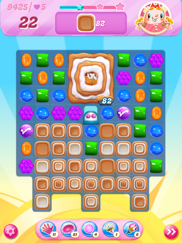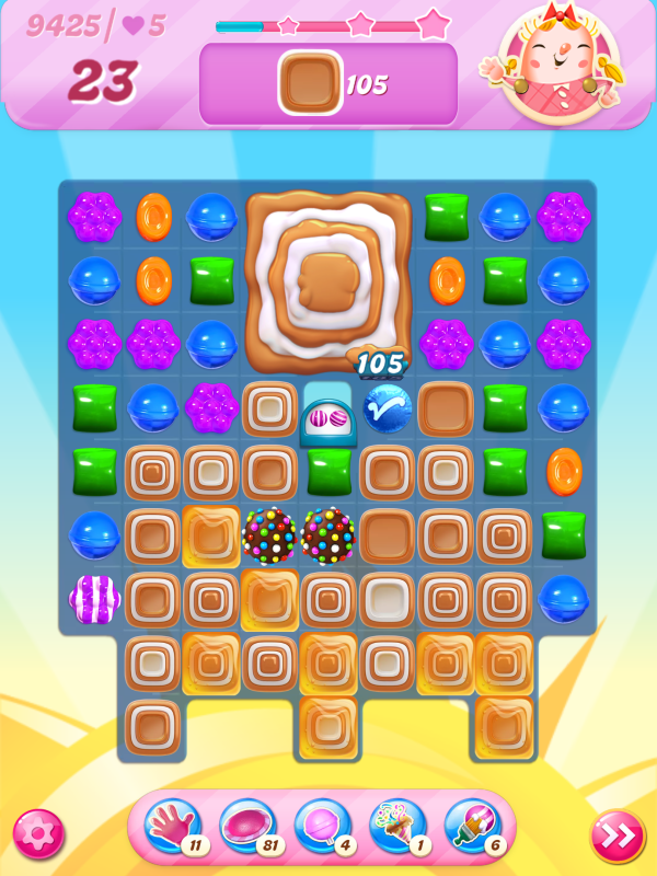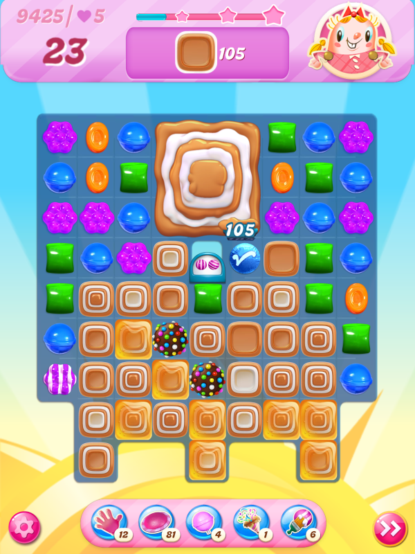 Now I notice that the count of toffees needed is very different even though I played practically identical games. This must be because of the first move I played above, the wrap/stripe combo being in a much better position on my starting board.