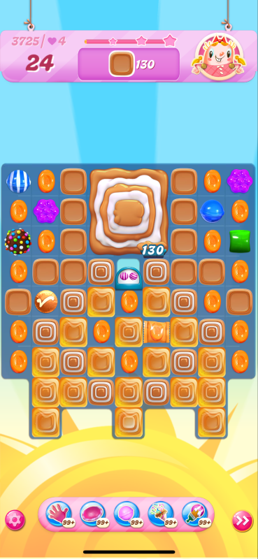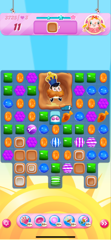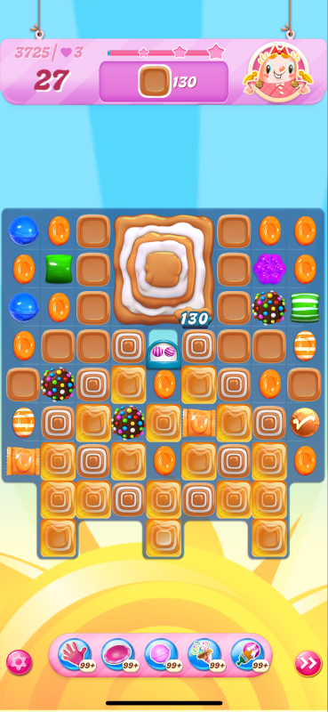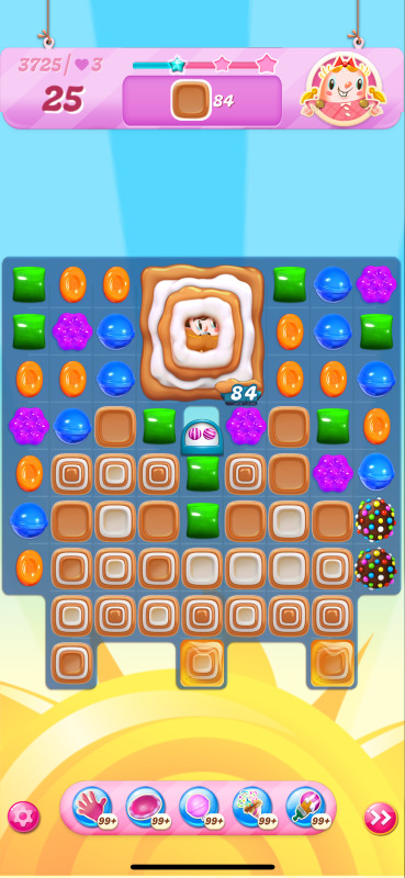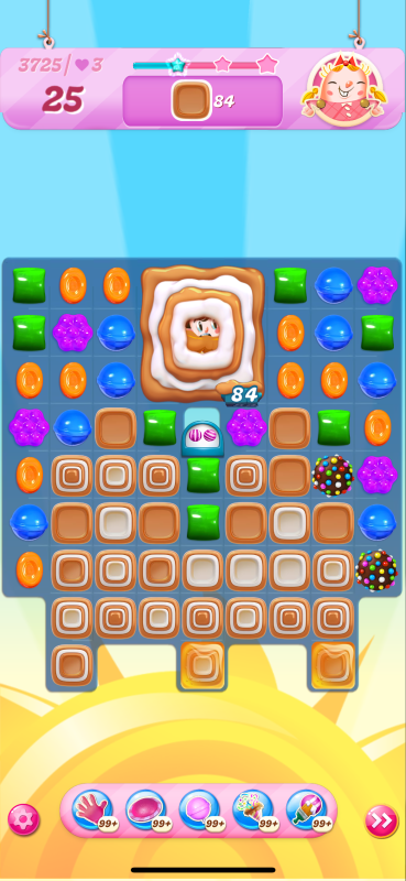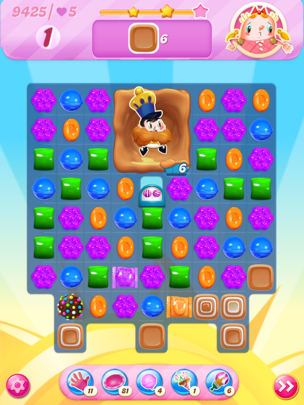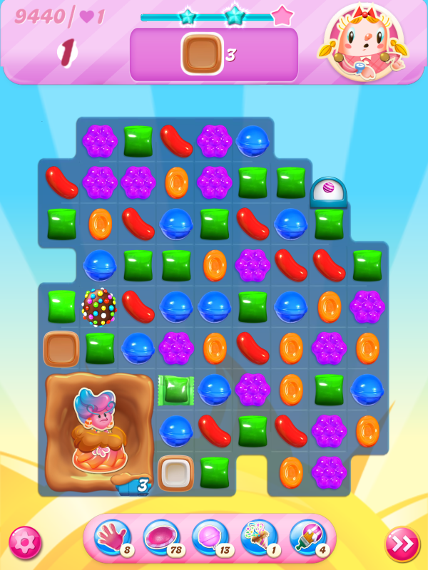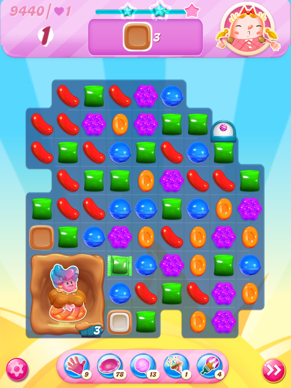 Now I notice that the count of toffees needed is very different even though I played practically identical games. This must be because of the first move I played above, the wrap/stripe combo being in a much better position on my starting board.