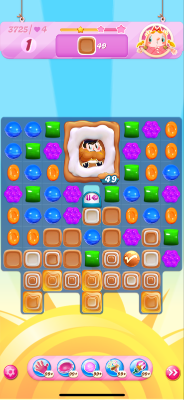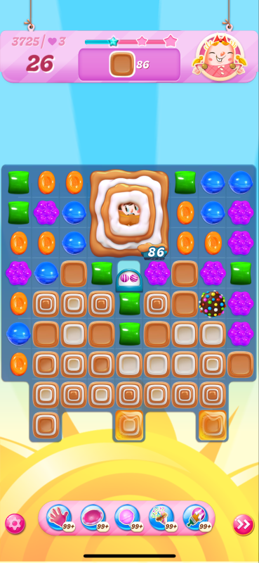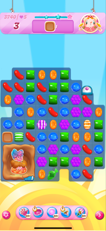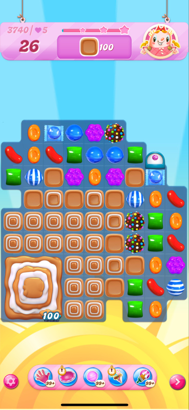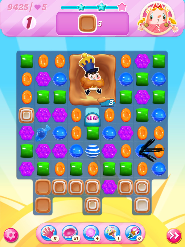 The harder version I get to a tricky place on my last move. I may have a winning move here, but I didn't see it and played the wrong match leading me to be one toffee short. I think though if I had played the move indicated by the arrow then I could have passed: