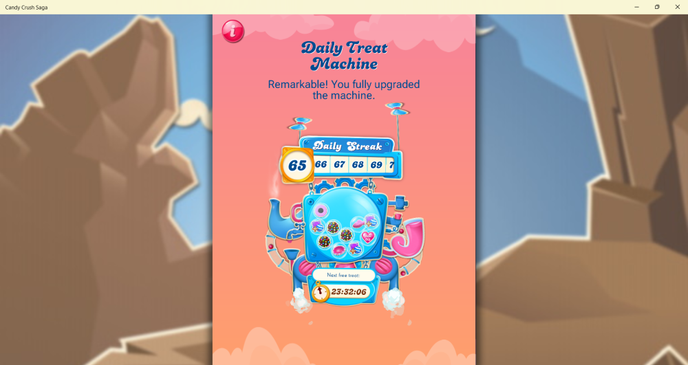 The screenshot says it all. The background of the treat machine is the ones used for streak counts 25-29, and you will have fewer chances of 15min Unlimited lives, meaning you're at the streak count 25-29 Daily Treat Machine albeit with a higher streak count (65 in my case). Is there any ETA when this will be fixed.