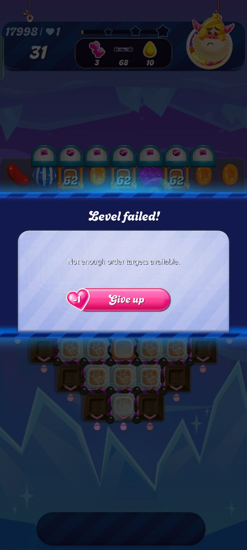 This may be a new glitch @MountainMom . The previous one was that there were not enough toffee on the board to open the order locks, but this never resulted in the message I see here. If this message appears at the very start of the level, as it appears here, the level is definitely faulty and needs to be reported (again! )