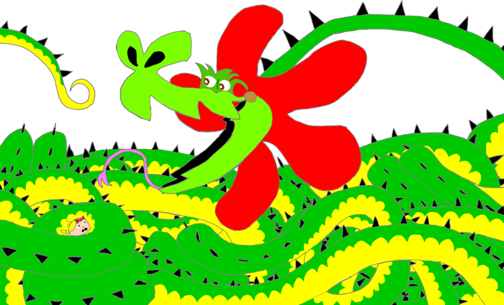 That's right, after having a healthy supply of sunlight and water while being a flowerpent under the spell of Stella (a cross between a flower and a snake), Denize has grown into the ultimate arboreal abomination in this season of nightmares and fear and Tiffi is first on her menu! Squeezing and crushing the poor little girl in a massive sea of thorny, plantlike coils, this ravenous beast then opens her leafy jaws, flicks her tongue and prepares to feast upon her victim!