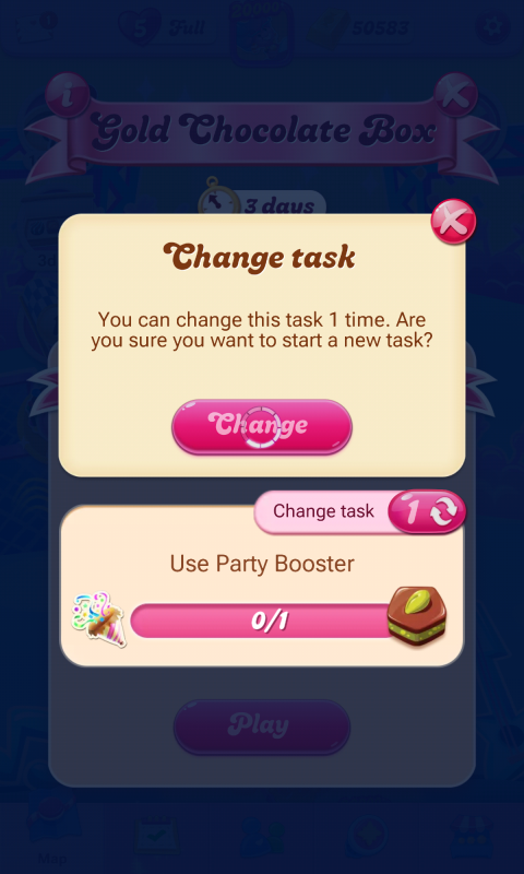My Gold Chocolate Box is not counting the completed tasks and you cannot change the task without the game freezing. This issue has been ongoing intermittently for several weeks. I updated my Game updated today hoping this would resolve the issue but no luck