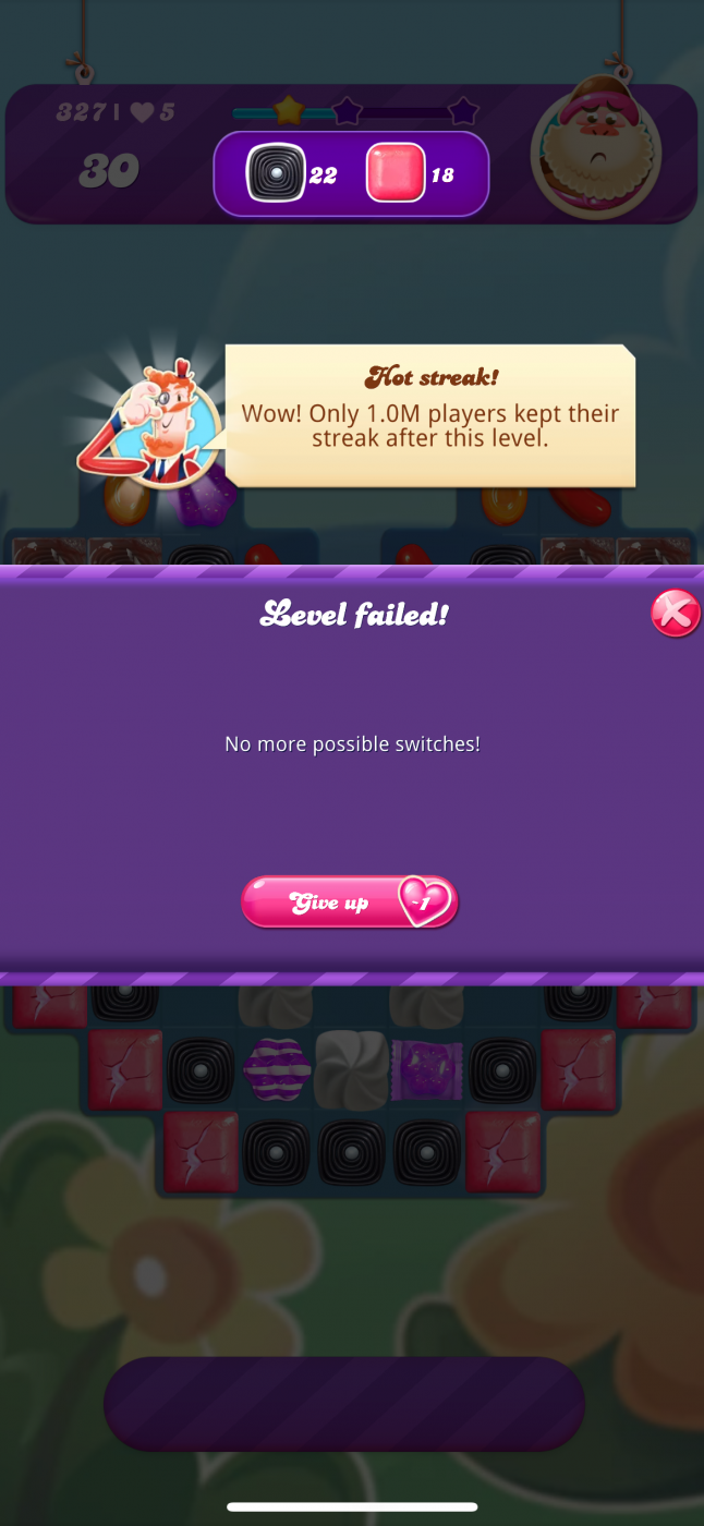 level failed due to no more possible switches. Life and streak lost. Please fix this issue if at all possible. Made 1 move and shuffle. Shuffle failed. Shuffling again. Then the screen below.