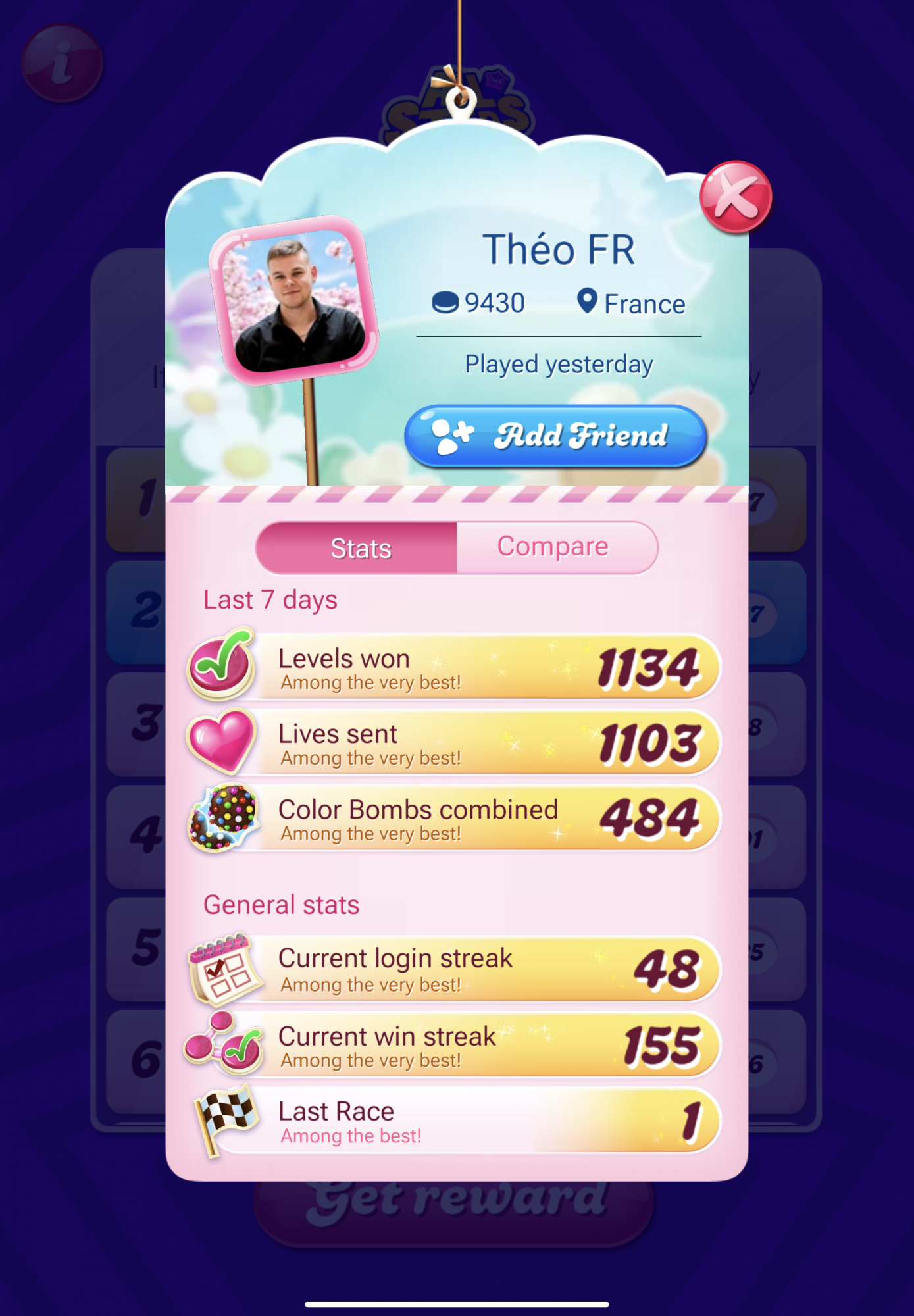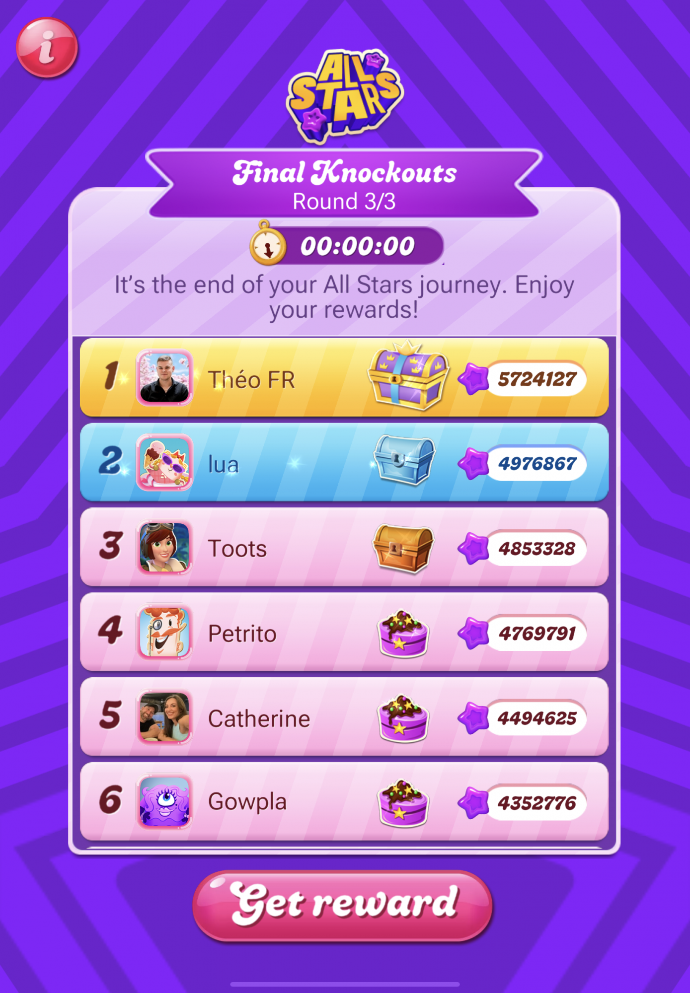 After a while of me maintaining the previous stated lead i was very aware of the scoring patterns me and theo were following, which i was observing very quickly trough glimpses as not to lose any time but also very intently, that’s when i started noticing theo’s score plateau for a couple minutes then jump 20k at time, i of course did not think of cheating when seeing that and simply thought he was taking advantage of tricks such as “tuck the frog” where u can spam boosters without winning on some specific levels and i even thought i should do the same when presented the opportunity, but this soon started happening at almost every level he passed where every 5-10 minutes he would score 20k or a little more getting really close to my score but i stared using as many boosters as i possibly could to try to keep my lead, which was presenting to be very hard since it’s definitely not every level where you can use many party poppers without winning, this however did not seem to be the truth for theo, even though our scores where getting closer i was trying really hard to maintain my lead and i was managing to do just that until his purple start count started going up even 60k(!) at once on one level, that’s when i stared to grow suspicious because even if u had all the party poppers in the world being able to spam them so often seems very much impossible for me. Even with such jumps i was managing to keep a very close score to him, even catching up to him in one occasion but as soon as i did that on the next level i passed, the leaderboard was suddenly showing that he was somehow 80k points ahead of me. I am not aware how such thing could’ve happened fairly especially since king implemented a 90k limit to each level this year and this seems suspiciously close to that for me. After that happened i was not able to get close to him again and maintained my place at second for the rest of the time. My mom tried to reach customer service for me and even tho at first they replied and asked for further information, when the information got submitted they never reached out to us again. all of this situation made me feel very unmotivated and for the last several hours of the competition i gave up on catching up to him and just wanted to be ahead of the 3rd place since i firmly believed player one wasn’t playing a fair game. i was very ahead of player 3 so i stopped playing competitively and just tried to stay on the second spot, which i did. i’ll post my leaderboard especially cuz i’ve seen some posted and i would at least like to see all 10 leaderboards so ill add to that.
