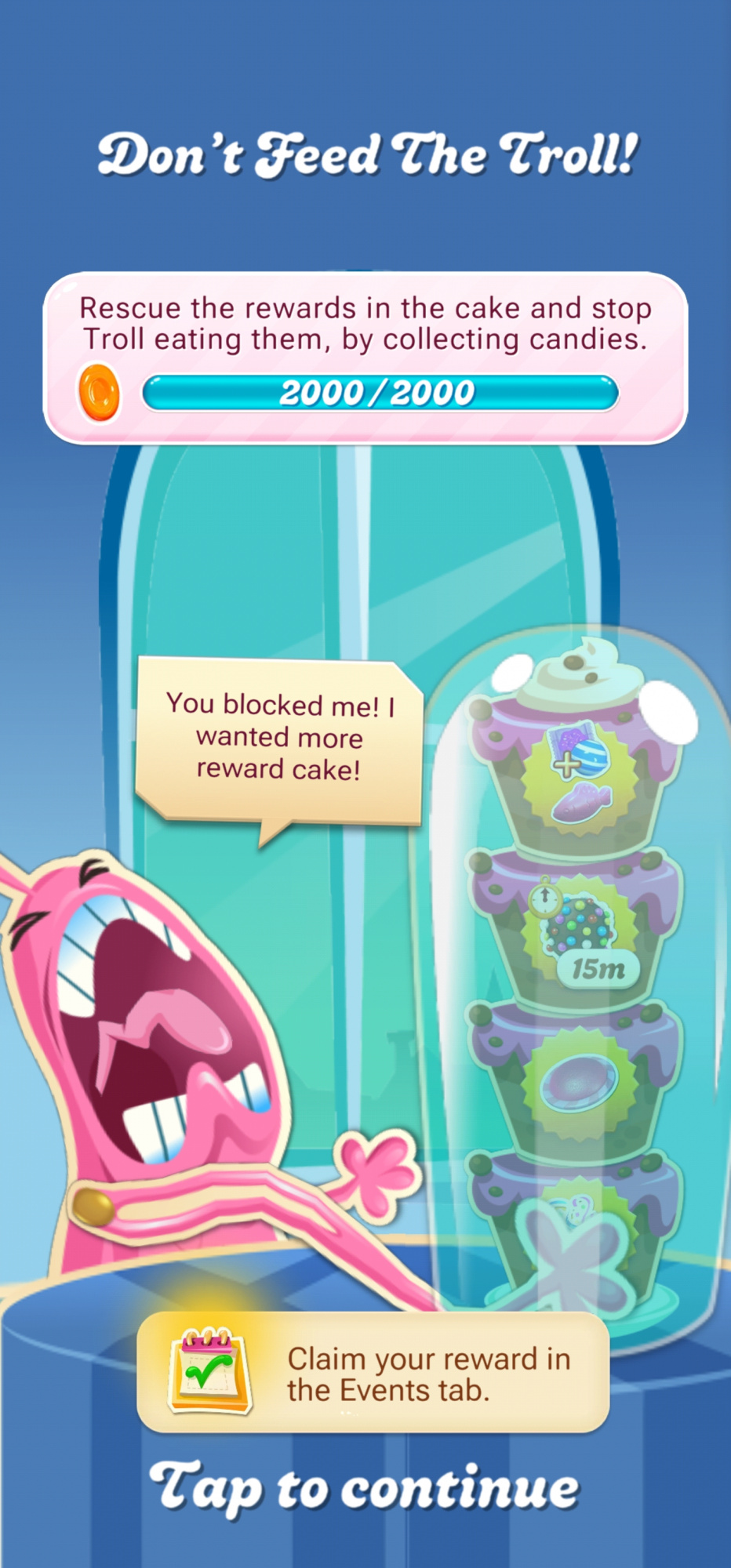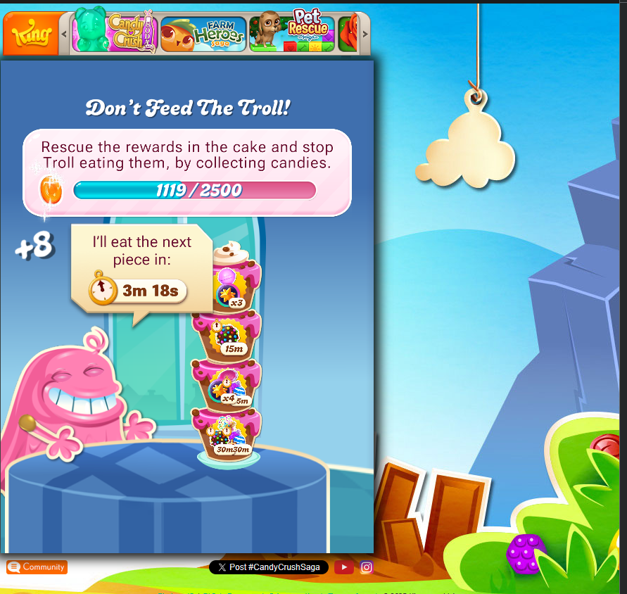 The bar is shown, showing how many candies to collect. One orange candy equals dealing 1 HP damage. Reduce the Troll's HP to zero before time runs out to win all the rewards.