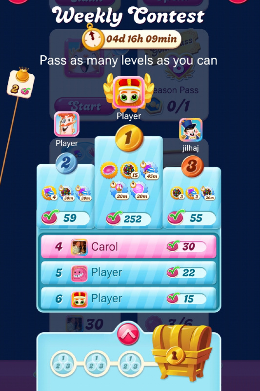 Re the Player Cards @QueenB this is a typical example of what many of us are seeing in our Weekly Contest. You will see the player in first place is showing as having passed 252 levels