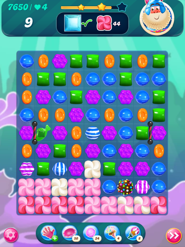 There is a really good chance I could have passed it without boosters from here on, but if you do have a hand switch and want to make 100% sure you pass you could use it here to bring the colour bomb and stripe side by side. I did this and passed within two more moves.