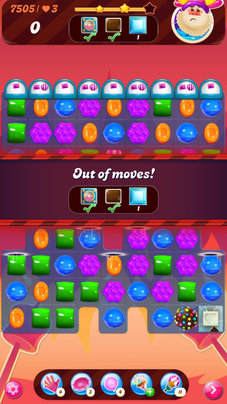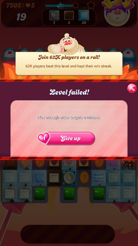 A similar situation can be seen with 7909 in where you must keep the magic mixer surrounded by liquorice fences intact while the order locks are not opened as they require Sugar Coats which are only spawned by the Magic Mixer and like the 11960 case, no warning will be issued to keep the mixer in the level while the order locks are locked. On both levels I lost because in the former I destroyed the chocolate too early and in the latter the fishes targeted the mixer surrounded by the liquorice fences and destroyed the mixer before it had the chance to spawn enough Sugar Coats to open the order locks.