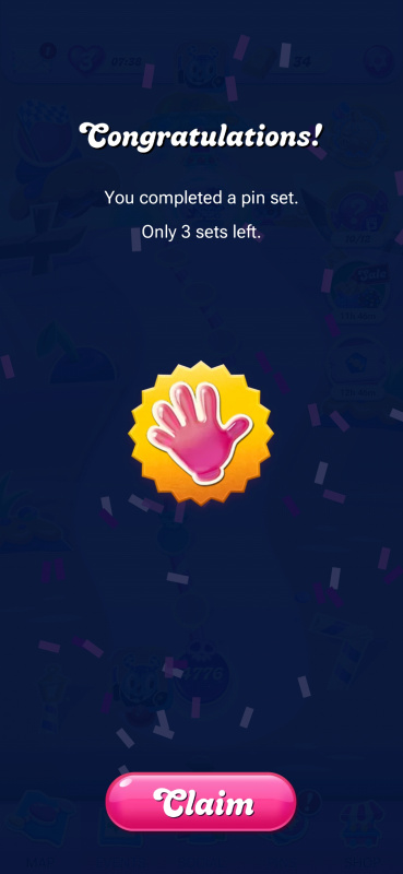 Candy Pins are a collectible reward system where you gather Pins by playing events and activities. Each Pin belongs to a themed Set (like “Yummy Yetis” or “Tasty Travels”), and completing Sets unlocks boosters!