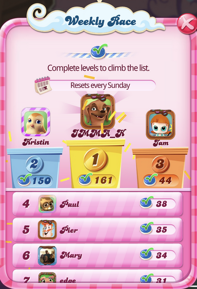 Thanks for tagging me @SeraphicStar. @natsplat, the weekly race that you are referring to is in Candy Crush Saga right? This started out without rewards and it was just to let the players know how many levels they cleared weekly compared to other players. Then the studio put a test on it and players were randomly chosen to win rewards for being in the top 3. From what someone told me recently he got an email saying that they weren't offering the rewards anymore. Perhaps they stopped the test or maybe that employee was misinformed. Either way, not everyone is getting these rewards since I think it's still under the testing phase.