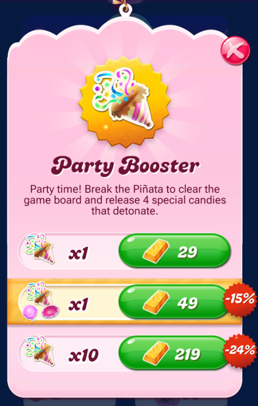 To buy a party booster with gold, you need to open your inventory and click on the party booster icon in the bottom row to get a pop-up with purchase options.